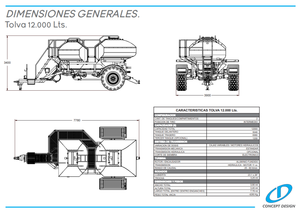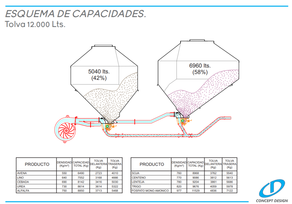 Posibilidad de incorporar una tercera tolva de 1200 lts. de capacidad para doble fertilización.